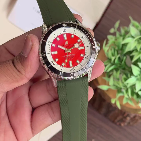 _This Breitling Superocean dazzles with its bold red dial, crisp indices, and rugged elegance, perfectly matched by the striking green strap._