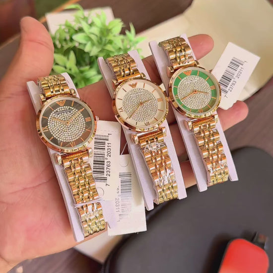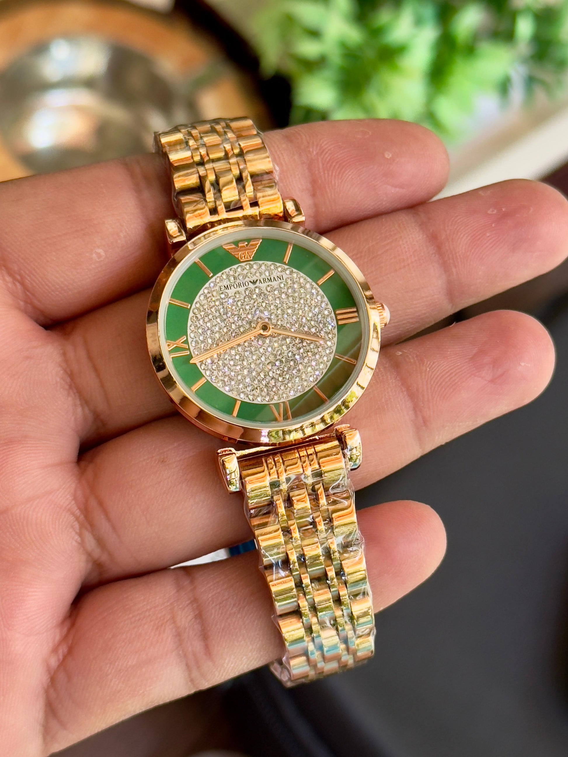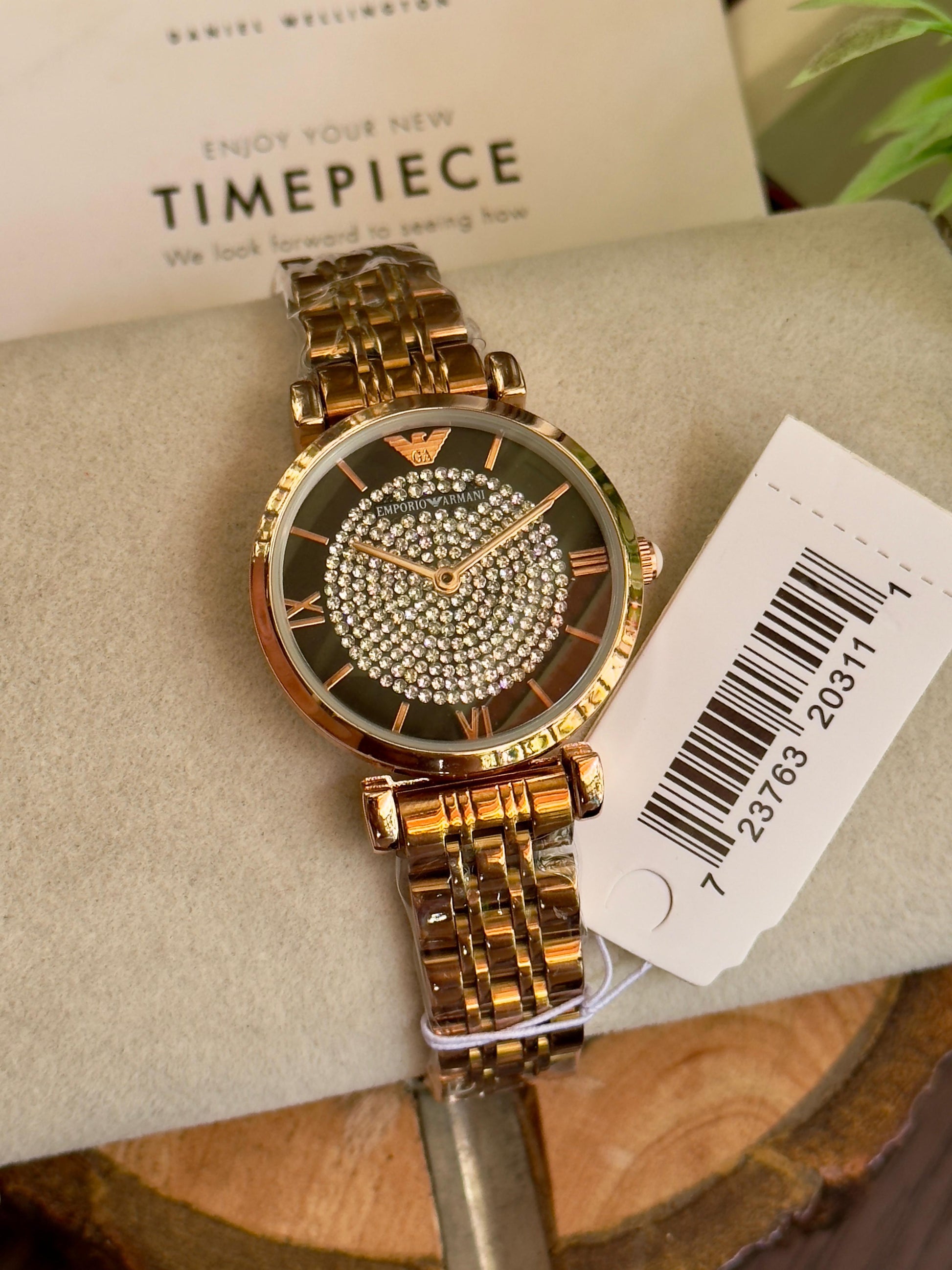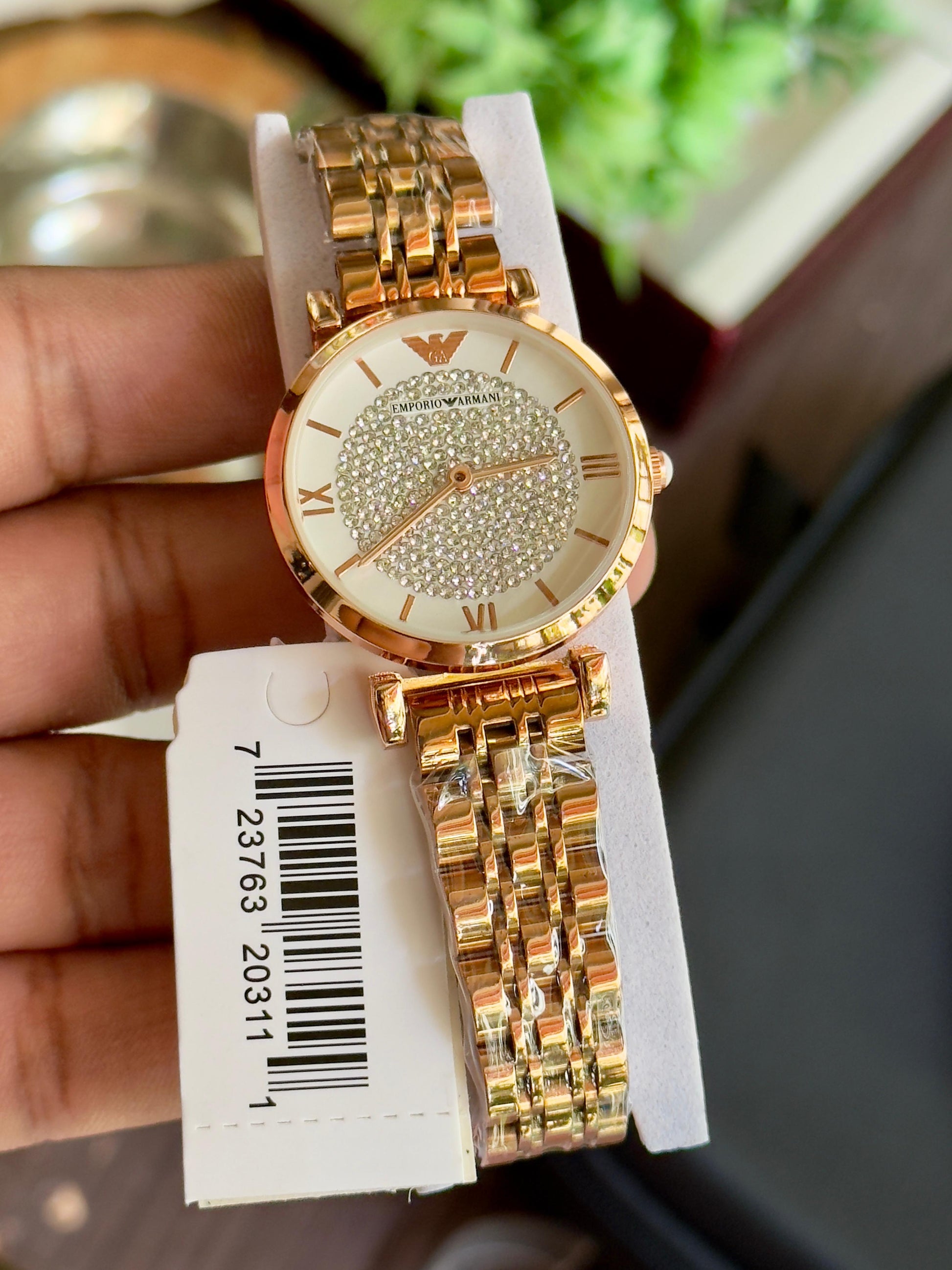 _This Emporio Armani watch exudes elegance with its dazzling crystal-studded dial and luxurious two-tone bracelet design._