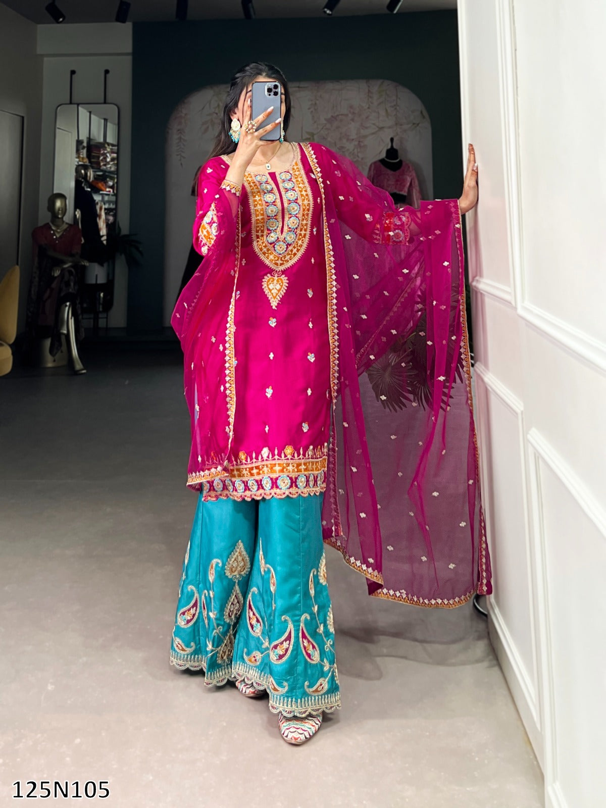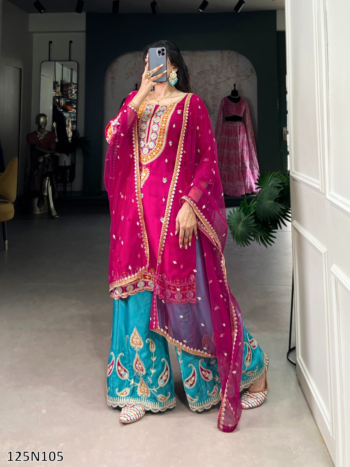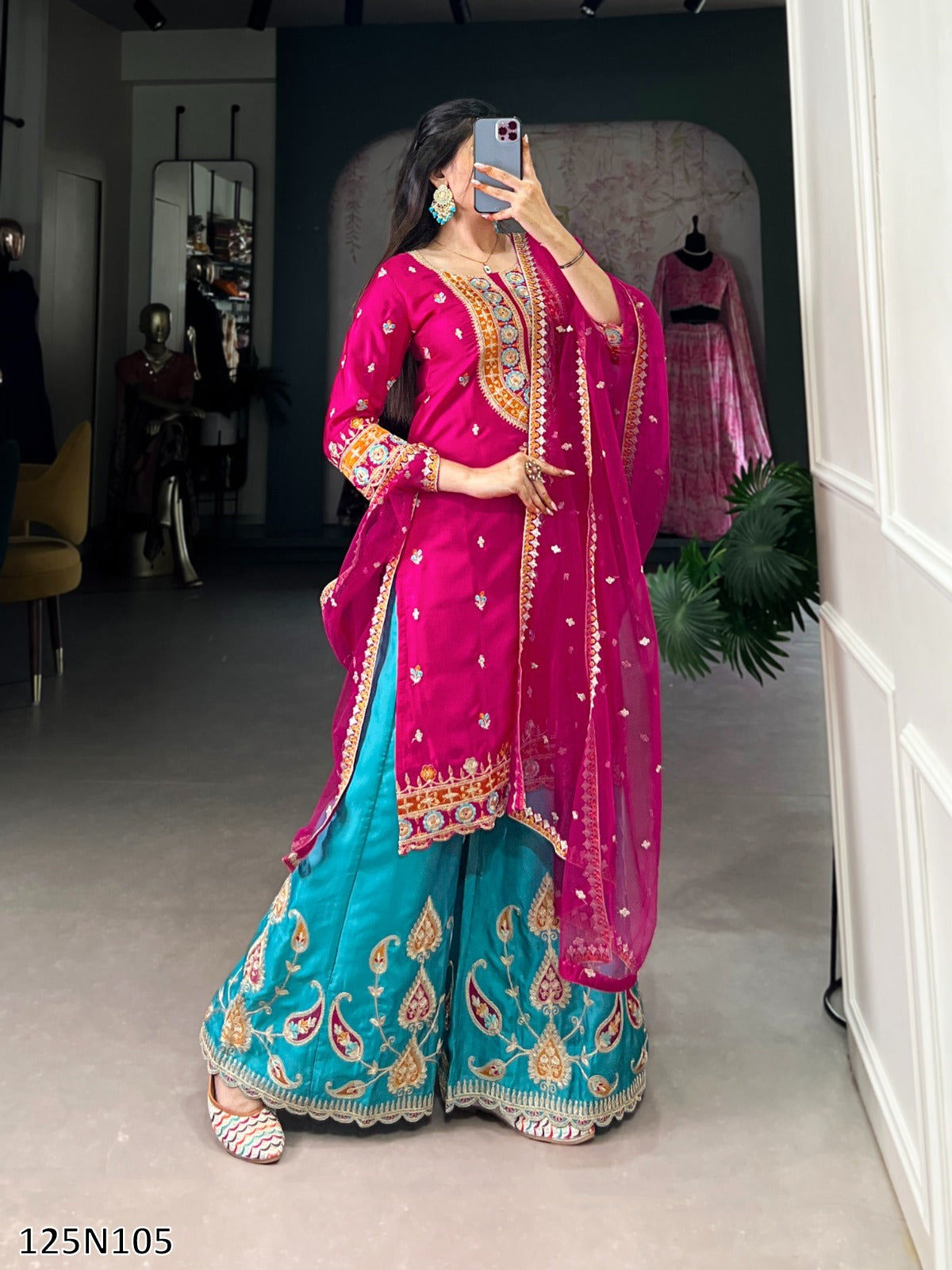 Bottom (Stitched) Bottom Fabric : Moonga Silk Bottom Work : Sequins and Thread Embroidery Work Bottom Waist : 38"(M), 42"(XL) Bottom Stitching : Elastic Bottom Length : 40