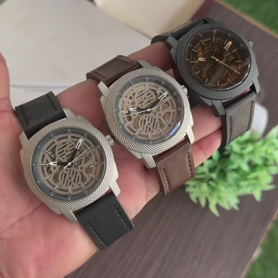 This Fossil watch stuns with its bold skeleton design, showcasing intricate mechanics through a sleek, industrial-chic aesthetic.