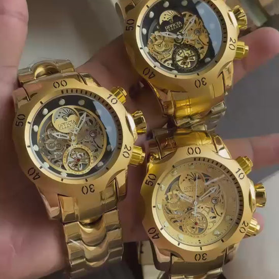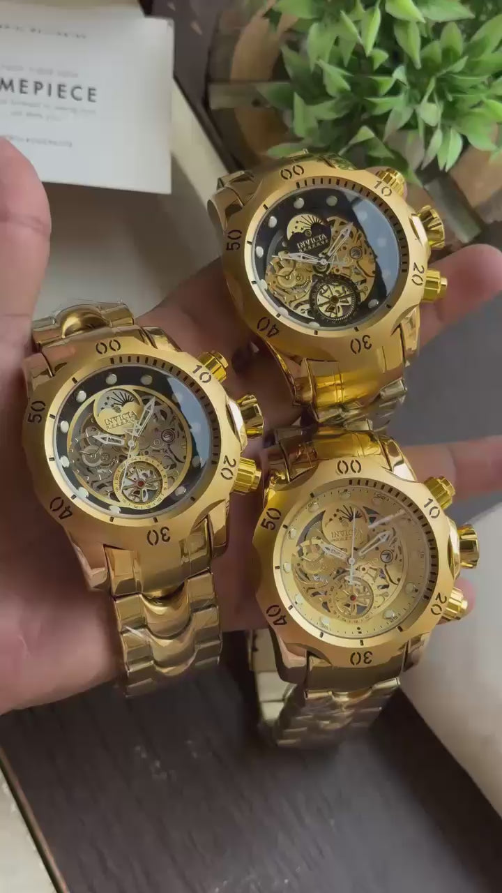 This gold  Invicta Reserve watch exudes bold luxury with its intricate skeleton dial and commanding presence.