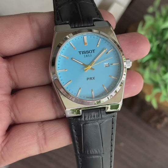 This Tissot PRX with its striking sky-blue dial and elegant leather strap is a perfect blend of modern charm and timeless sophistication.
